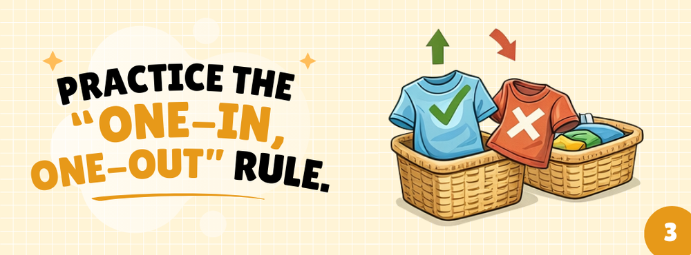 This habit works especially well for clothing, kids’ items, and décor. Before buying something new, ask yourself if you’re willing to let go of something else. It encourages thoughtful purchases and turns decluttering into a continuous, manageable habit instead of a once-a-year chore.