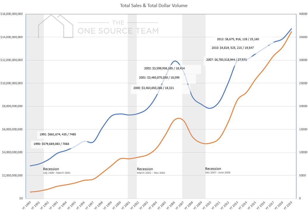 The most obvious question for any buyer or seller is “What did this do to home prices?” The surprising and consistent answer is, “Not much.” We don’t have data for 1989, but 1990 finished the year with an average sales price of $81,770 (whoa!) 1991 saw an average of $88,132, which is average appreciation of 7.7%. The 2001 recession saw a very similar lack of price changes. The average sales price increased in 2001 by 1.3% and it increased again in 2002 by 2.6%. The 2001 recession appears to have slowed appreciation, but prices didn’t decrease. (The median price saw similar movement.)